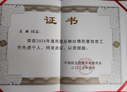 近日,民盟中央2025年参政议政会议在北京召开。全国人大常委会委员、民盟中央副主席张道宏出席会议并讲话。法学与社会学学院副教授,民盟青海省委理论工作委员会副主任马麒荣获“2024年度民盟反映社情民意信息工作先进个人”。